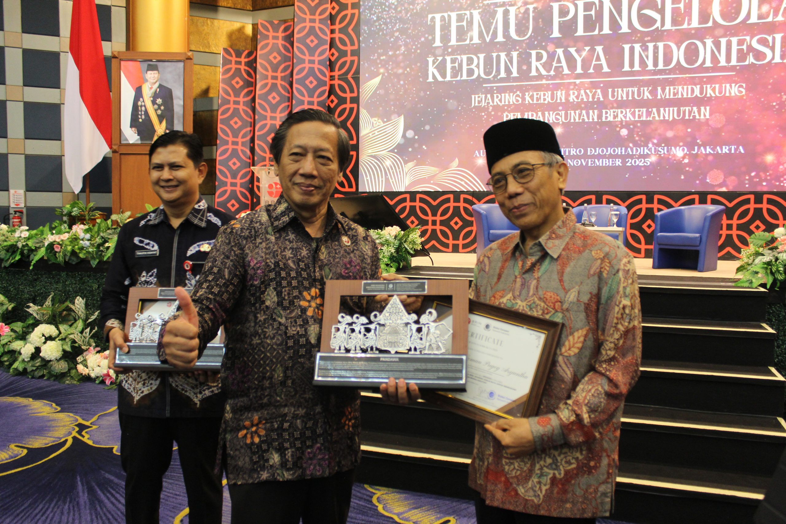 The award was presented by BRIN during the Temu Pendamping Kebun Raya Indonesia in Jakarta on Thursday, 13 November 2025. On this occasion, the award was received directly by the Head of UPA Konservasi Flora Sumatera, Alawiyah, S.P., M.Hut. At the same event, the Rector of Itera, also served as a speaker with the topic “The Role of Universities in Promoting Conservation Efforts and Their Linkages with Sustainable Development.” In his session, the Rector highlighted the strategic role of universities in developing botanic gardens as centres of conservation, research, and education that support the achievement of the Sustainable Development Goals (SDGs).