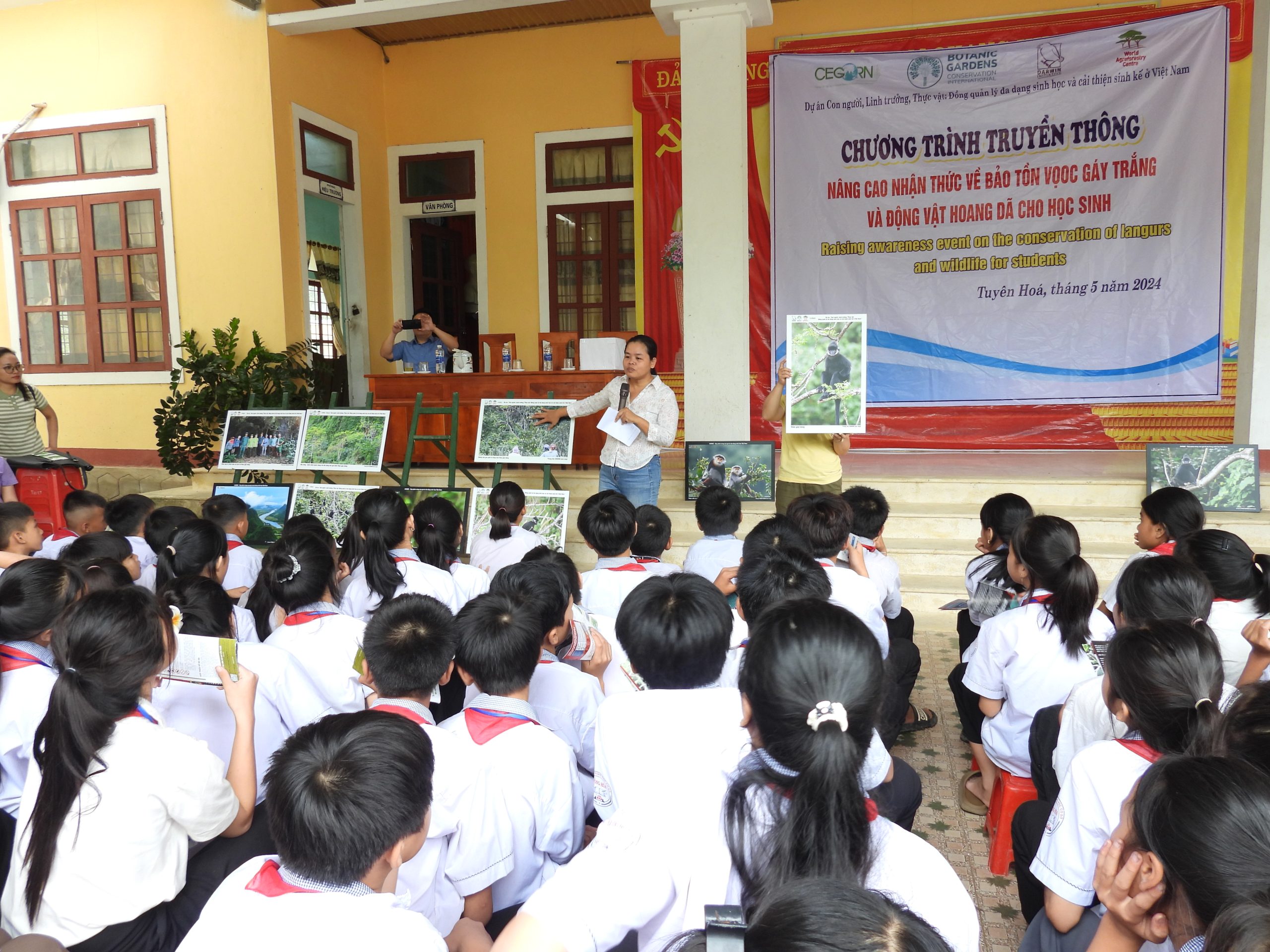 School activities for primary and secondary schools to equip students with the necessary knowledge and raise their awareness about the White-necked langurs and their habitat in Tuyen Hoa district, as well as their protection and possible disease transmission.